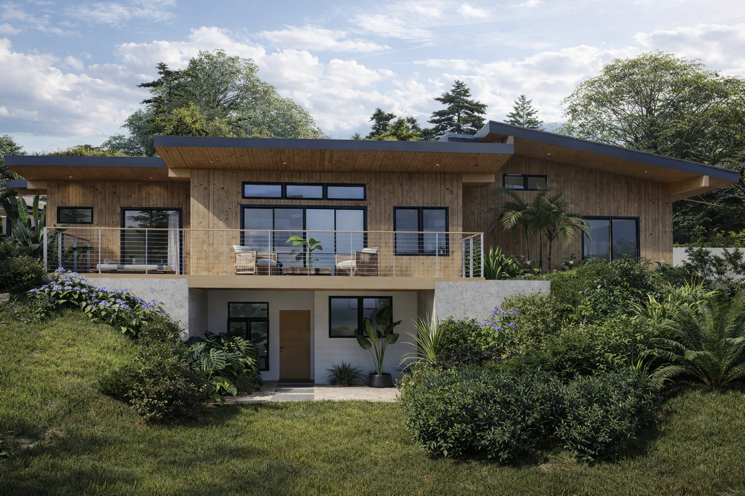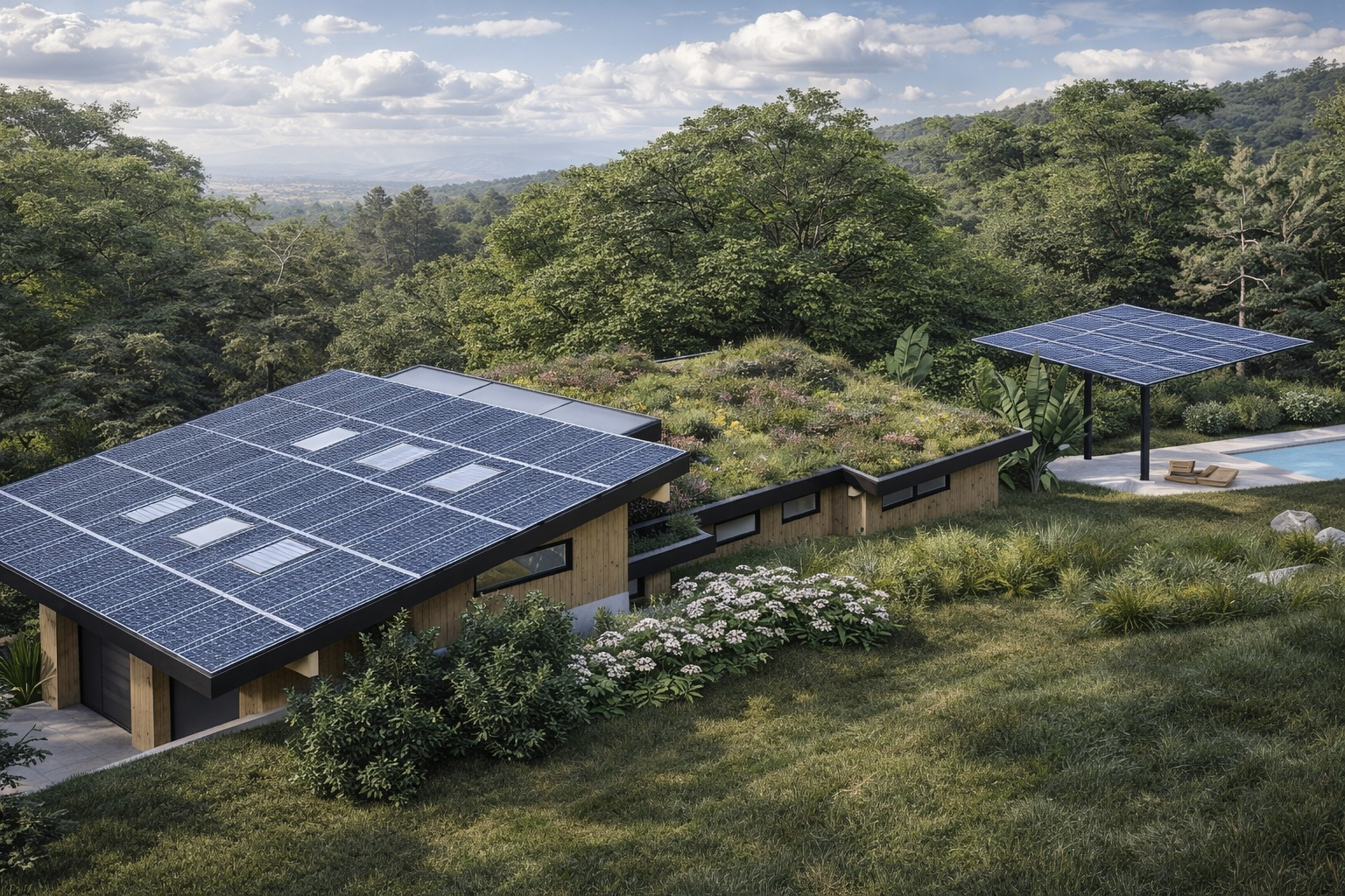 As with all Hawaii Off Grid designs, the roof is a focal point for reducing the carbon footprint. Half the roof is solar, the other half is a 'green roof'. The green roof helps control the temperature and capture rainwater. It also helps blend the building into the surroundings.