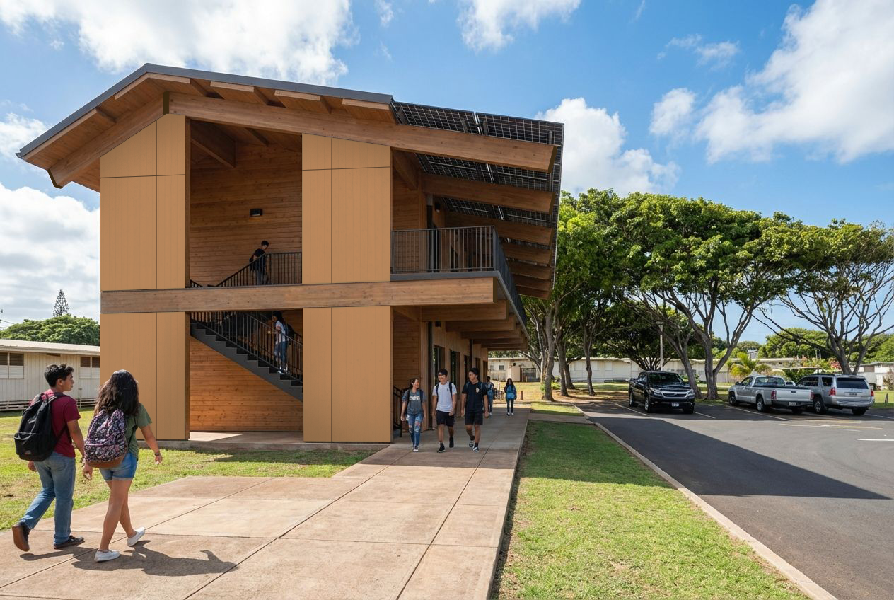 The Hawai’i School Facilities Authority (HISFA) has been tasked with solving these long-extant problems to enable the efficient building of school facilities. Through collaboration with HISFA and TimberQuest (a California based mass timber manufacturer), we aim to create inclusive, sustainable, and economical projects that do not just shelter students, but revitalize Hawai‘i’s construction industry rather than rendering it obsolete.